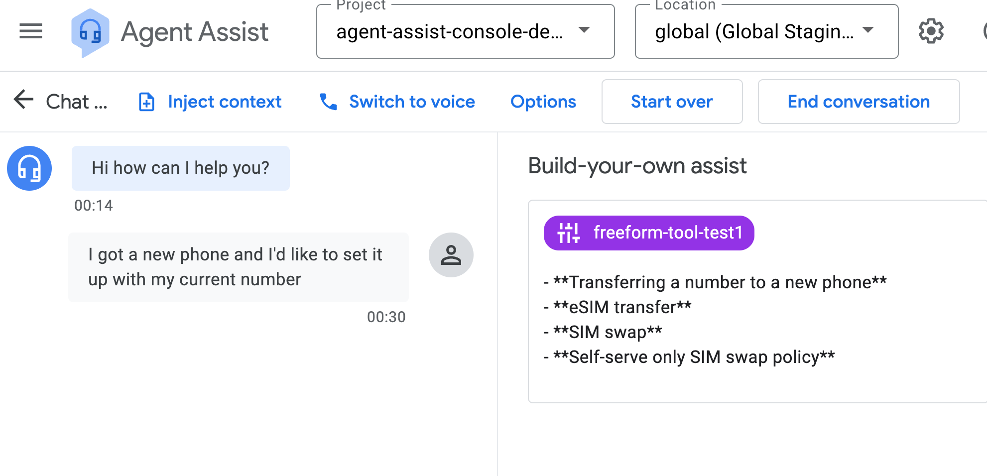 { "displayName": "build-your-own-assist-test", "humanAgentAssistantConfig": { "humanAgentSuggestionConfig": { "generators": "projects/PROJECT_ID/locations/global/generators/GENERATOR_ID" } } }