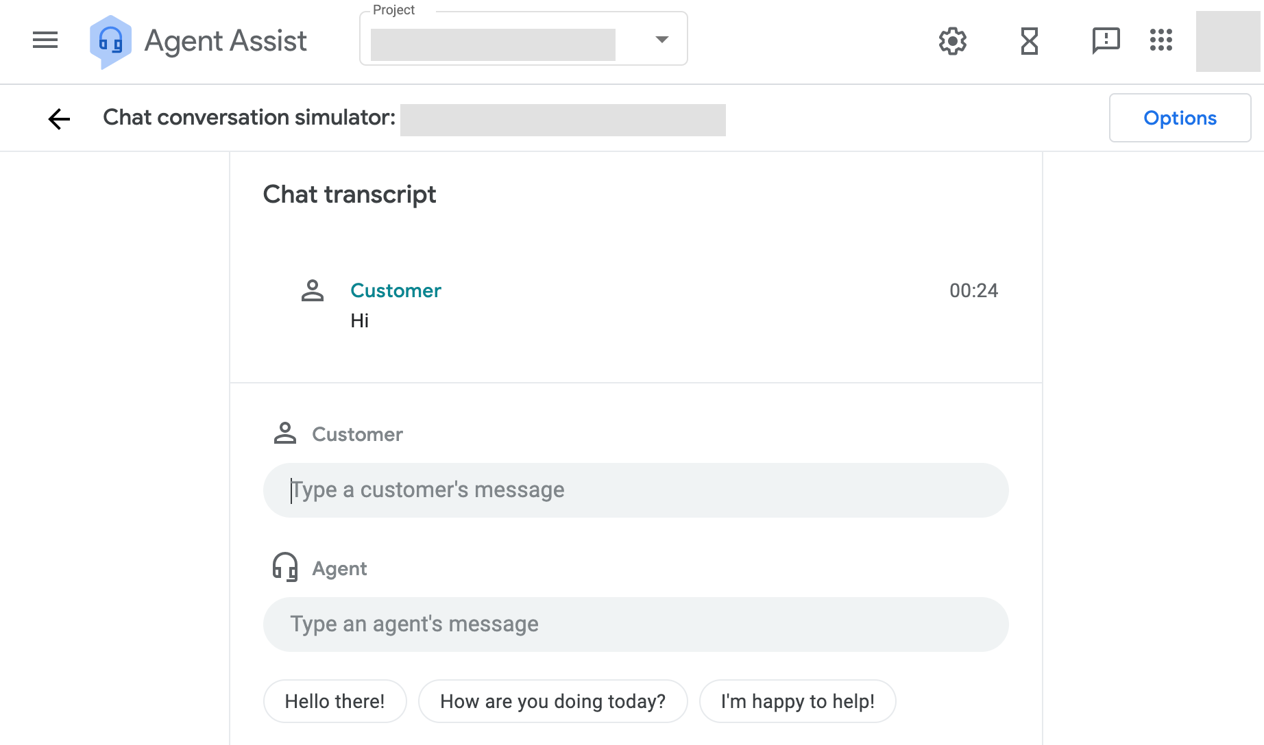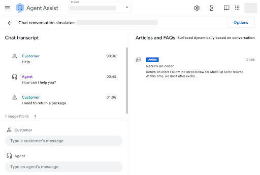 The window that appears provides you with input boxes for both customer and agent responses. You can test conversation profiles by inputting text and evaluating the resulting suggestions. If your conversation profile is configured to suggest both replies and articles, you can choose to enable either feature or all simultaneously by clicking the Options button at the top right of the simulator page and making a selection.