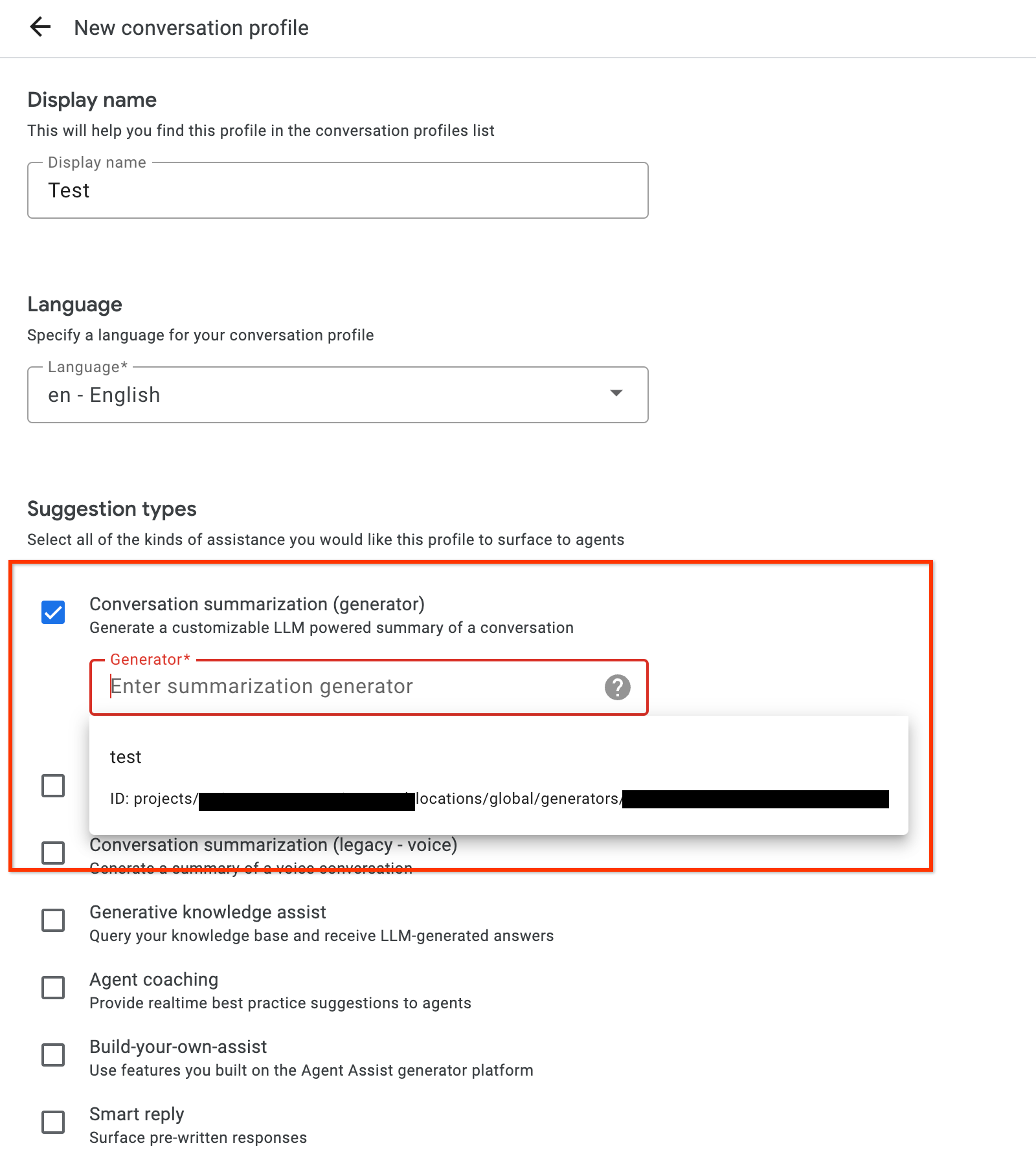 Select Conversation summarization (generator) as the suggestion type.