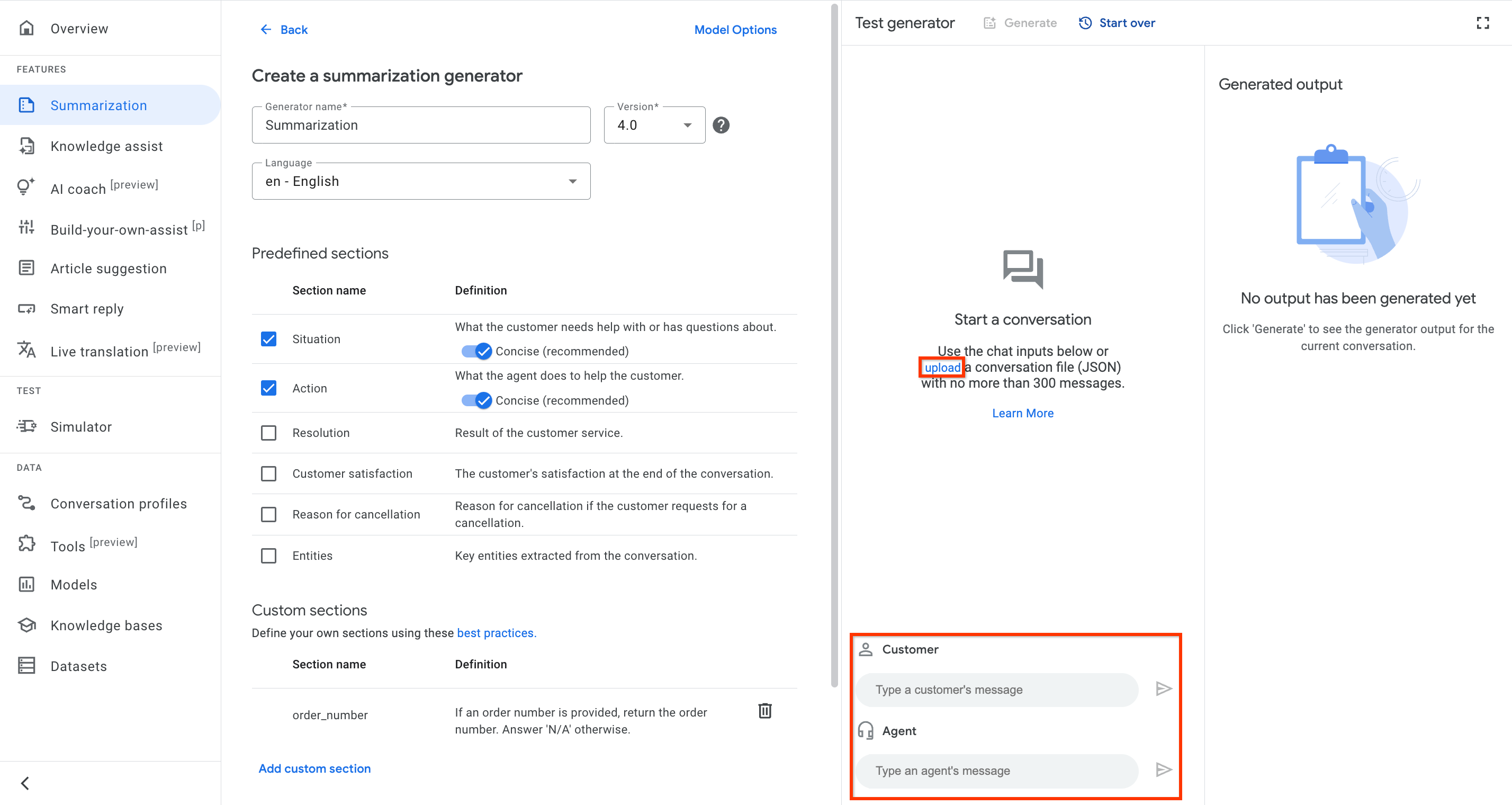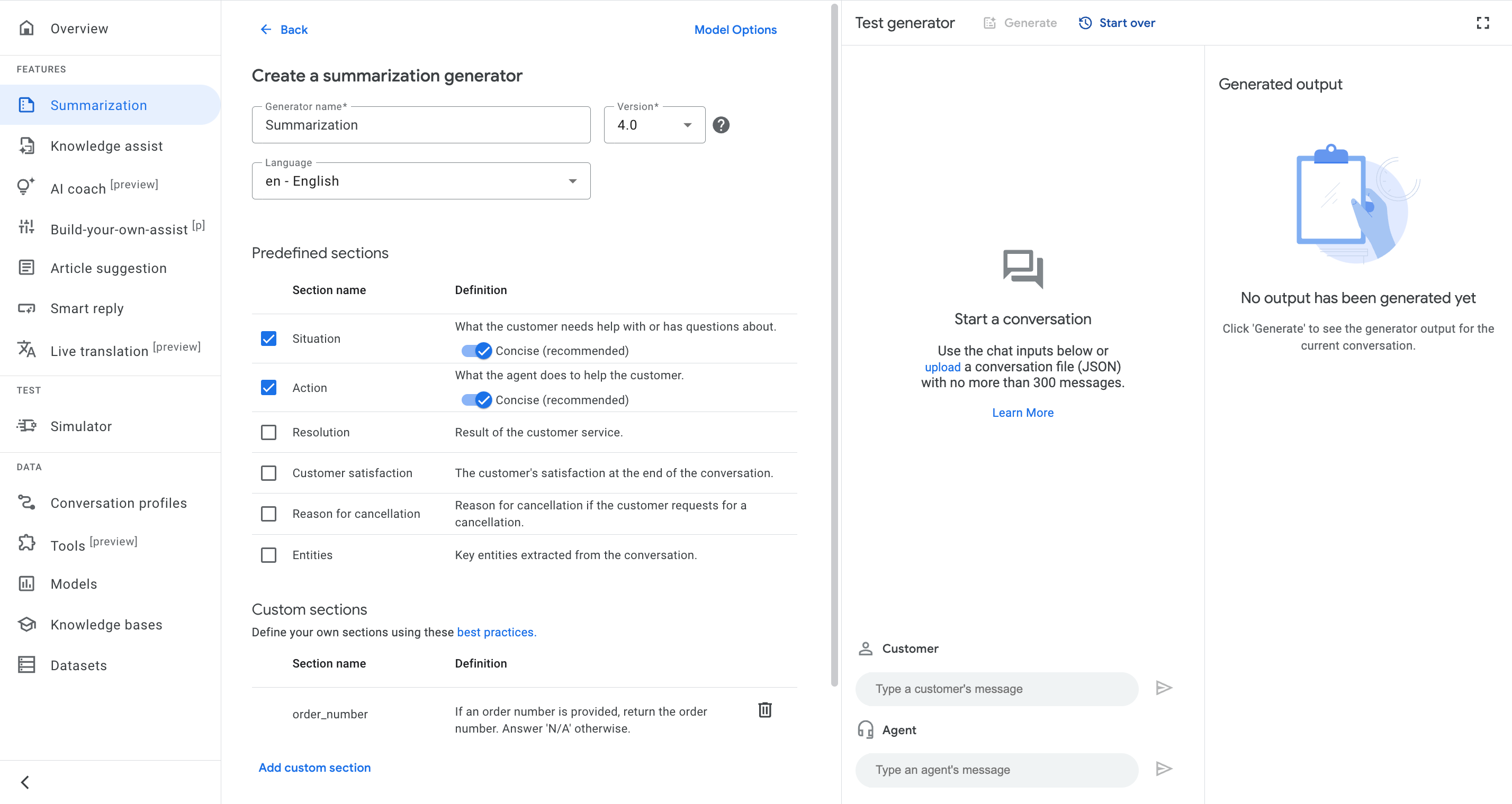 In the console, go to the Summarization page and select Generator.