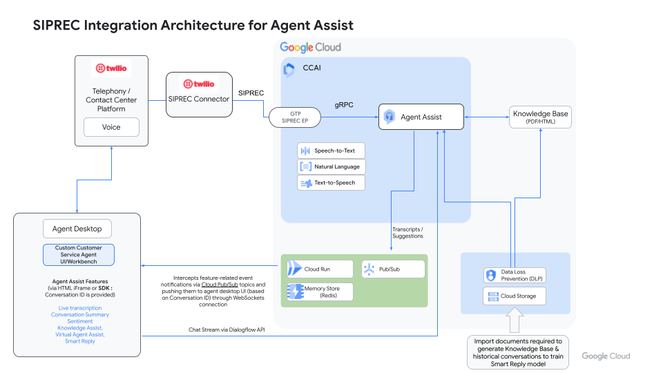 As part of CCAI, Agent Assist can then send transcripts of that voice data with suggestions back to the Twilio agent desktop using Cloud Run, Pub/Sub, and Memorystore for Redis.
