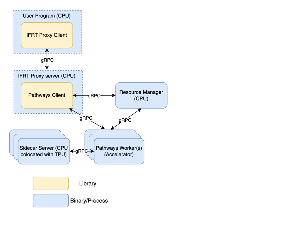 These are the processes that run on the accelerator machines (TPU VMs). They receive compiled executables of your program from the IFRT proxy server and they perform the computations on the TPUs. Pathways workers send data back to your program over the IFRT proxy server. This component requires accelerator resources.