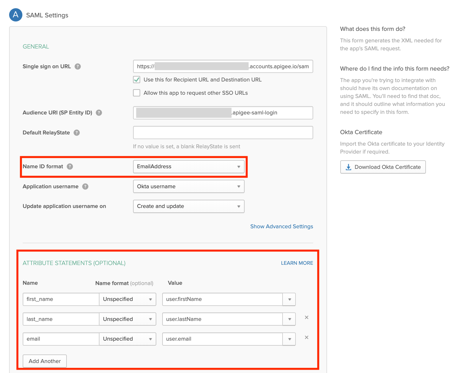 The following shows how to configure custom user attributes and the NameID attribute using Okta as your third-party SAML identity provider.