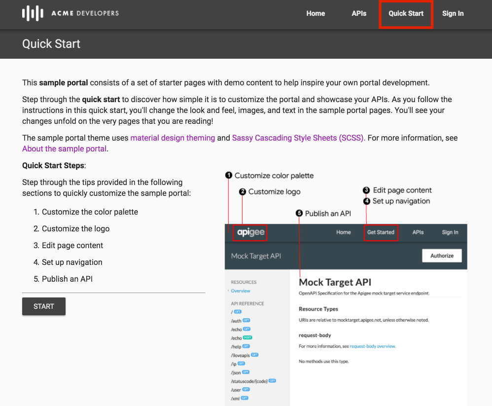 showcase your APIs. As you follow the instructions in this quick start, you'll change the look and feel, images, and text in the sample portal pages. You'll see your changes unfold on the very pages that you are reading!