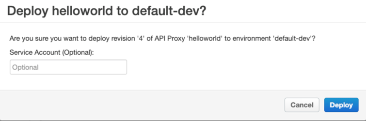 use the Apigee UI or API to deploy the proxy. To learn more, see Deploying an API proxy.