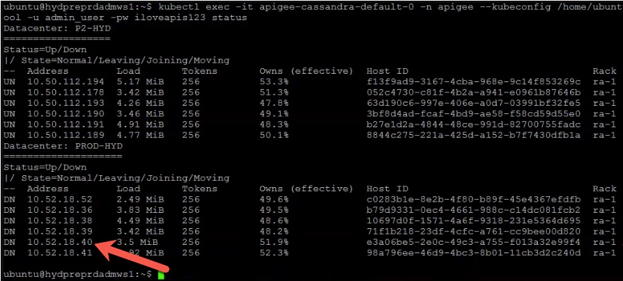 A node with address 10.52.18.40 already existsindicates that there exists a stale reference to one of the secondary region Cassandra pods with the IP address10.52.18.40. Validate this by running thenodetool statuscommand in the primary region.Sample Output: