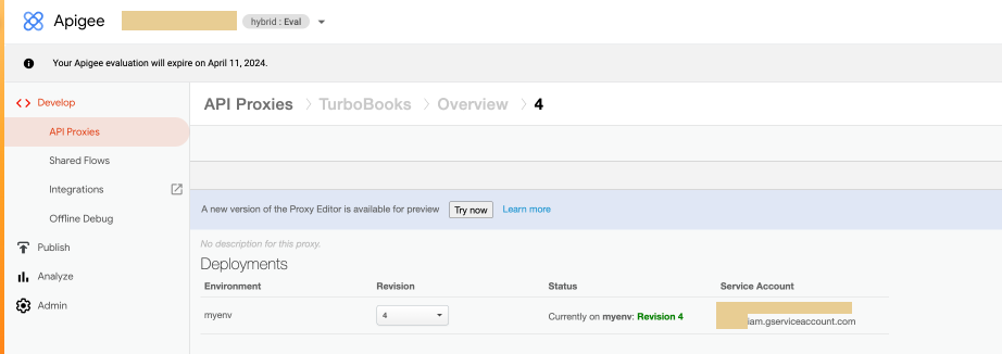 { "environment": "myenv", "apiProxy": "TurboBooks", "revision": "4", "deployStartTime": "1687408163394", "state": "READY", "instances": [ { "instance": "apiginstance", "deployedRevisions": [ { "revision": "4", "percentage": 100 } . . . . "serviceAccount": "projects/-/serviceAccounts/envsa-79@apigee-example-org.iam.gserviceaccount.com" }