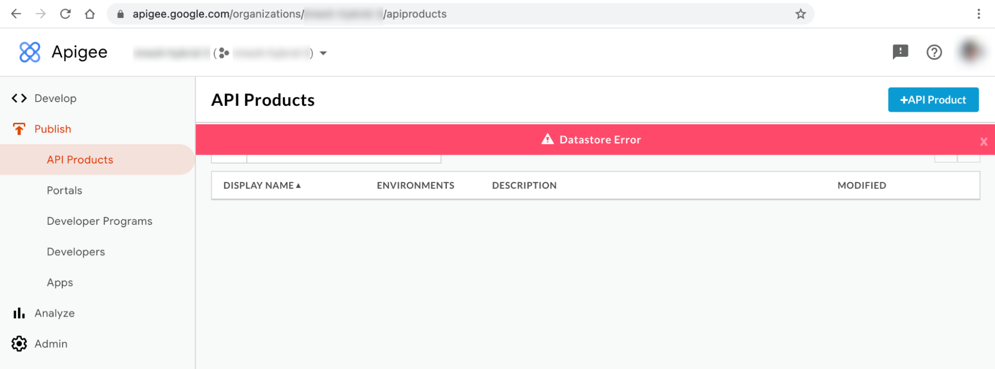 You may observe the Datastore Error on the API Products and Apps pages of the hybrid UI as shown below: