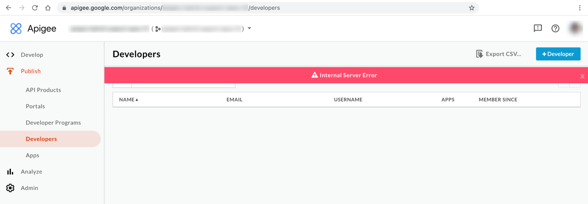 You may observe Internal Server Error on the Developers page of the UI as shown below: