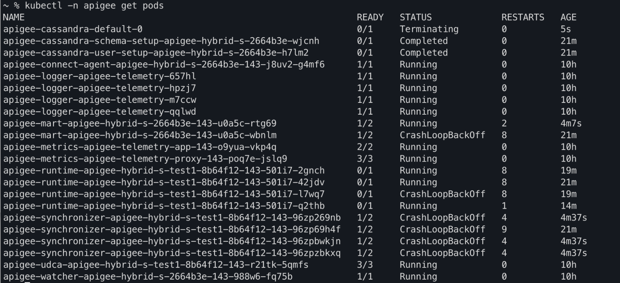 NAME READY STATUS RESTARTS AGE apigee-cassandra-0 0/1 CrashLoopBackoff 0 10m
