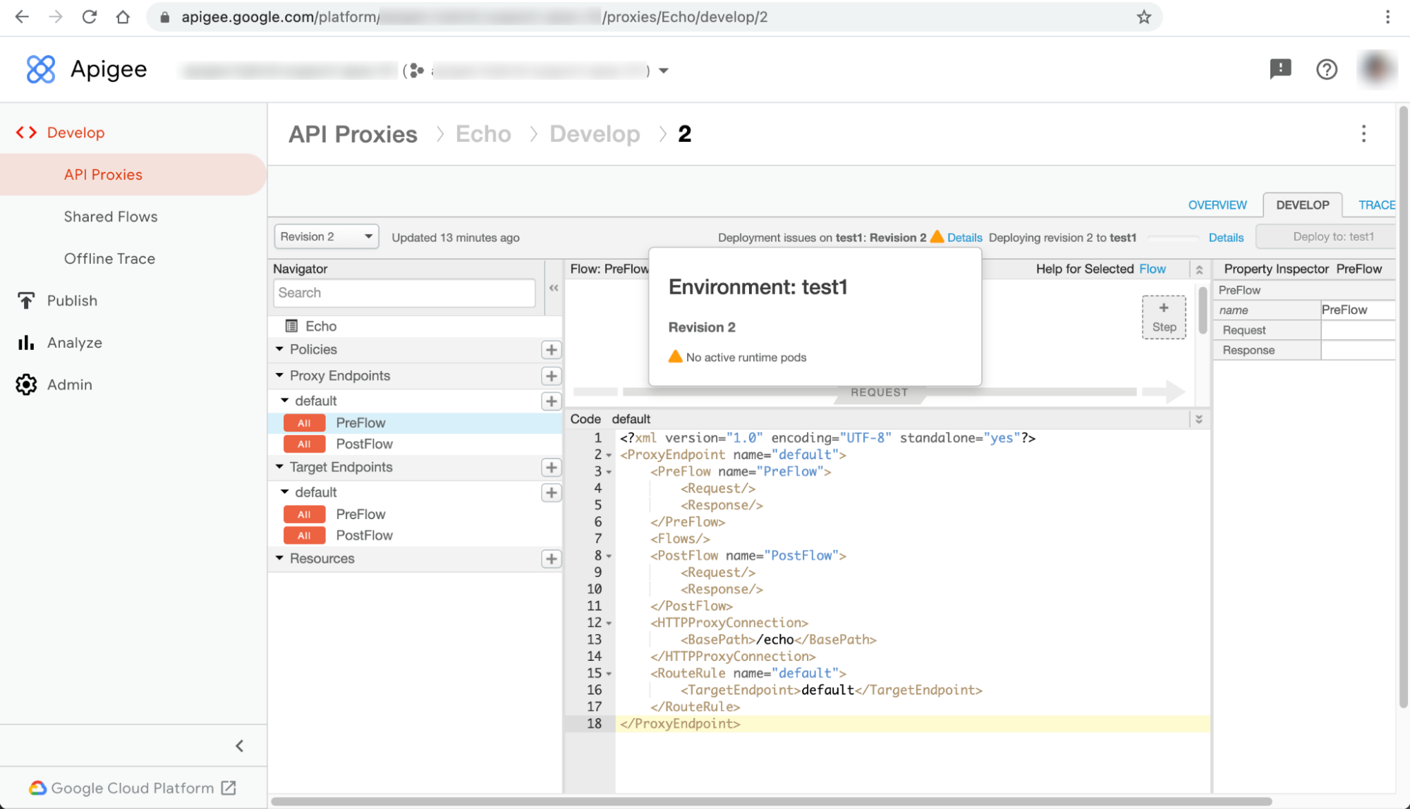 The No active runtime pods warning is displayed in the Details dialog next to the error message Deployment issues on ENVIRONMENT: REVISION_NUMBER on the API proxy page:
