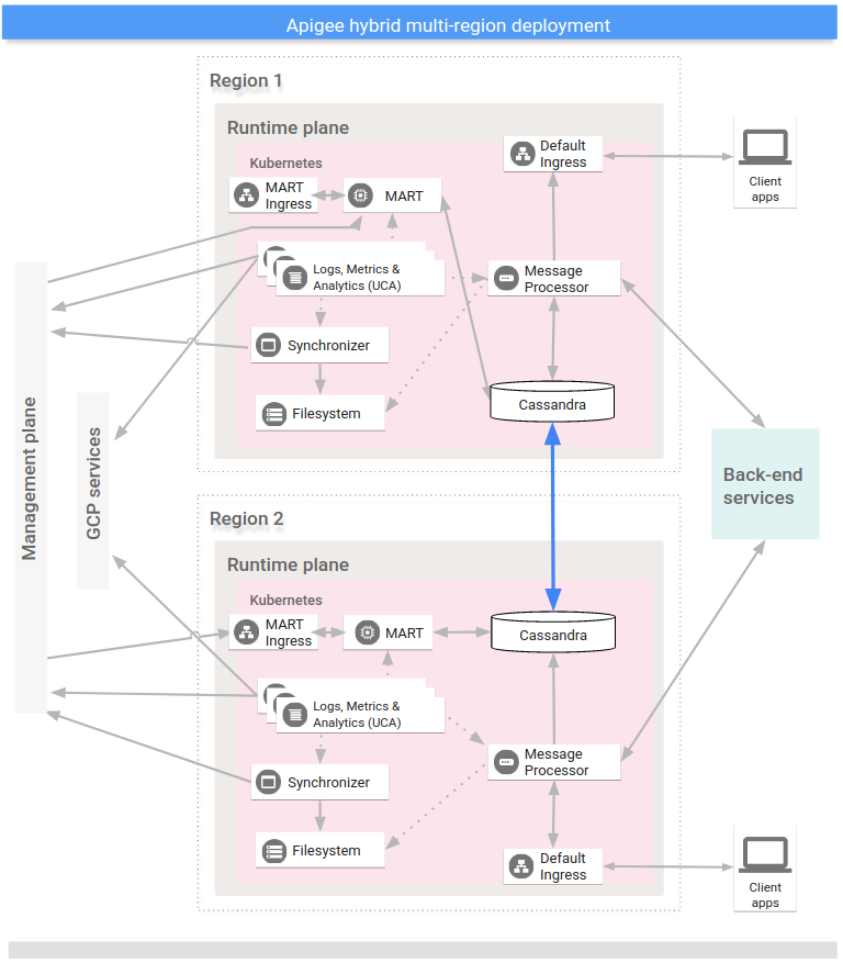 The regions in a multi-region hybrid deployment communicate via Cassandra, as the following image shows: