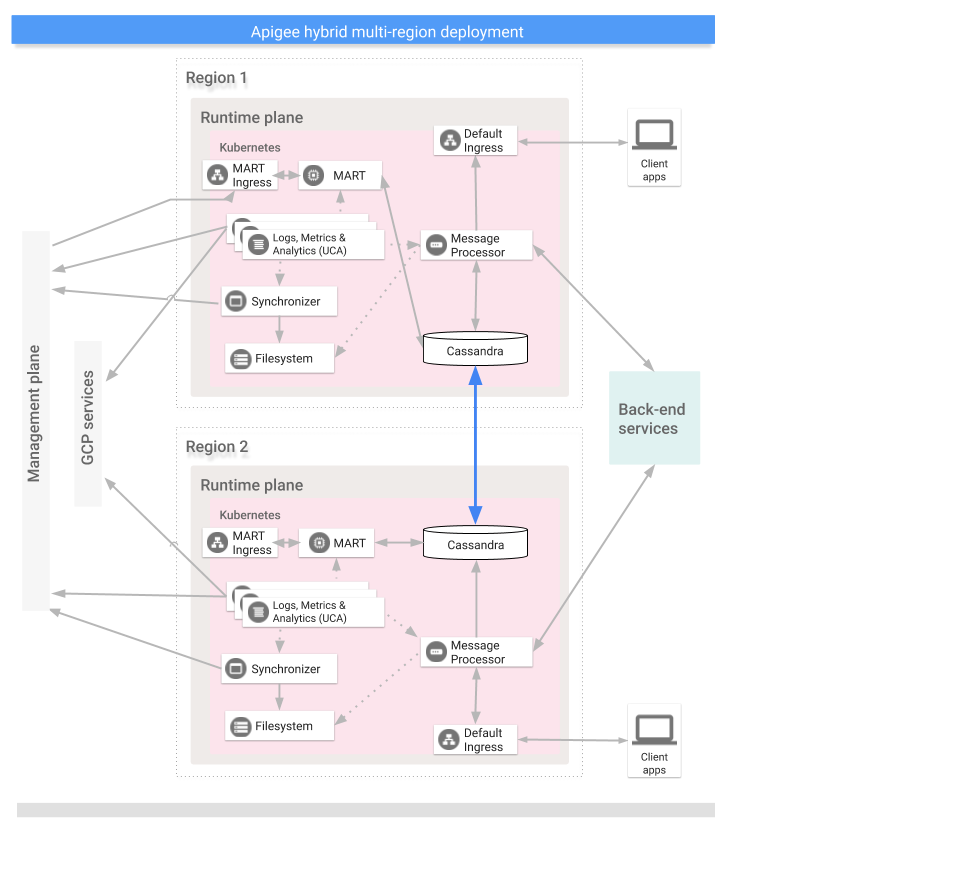 The regions in a multi-region hybrid deployment communicate via Cassandra, as the following image shows: