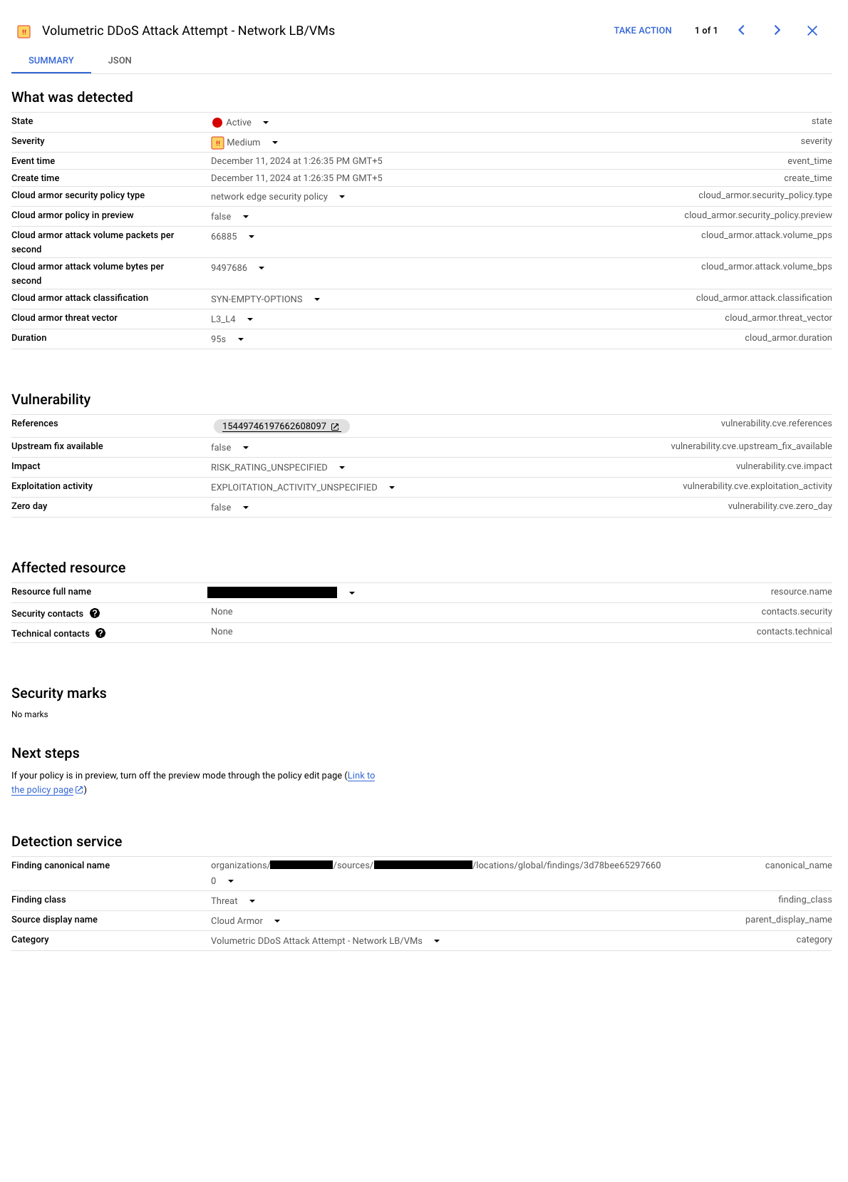 | Mitigation start | resource.type="network_security_policy" jsonPayload.mitigationType="MITIGATION_STARTED" |