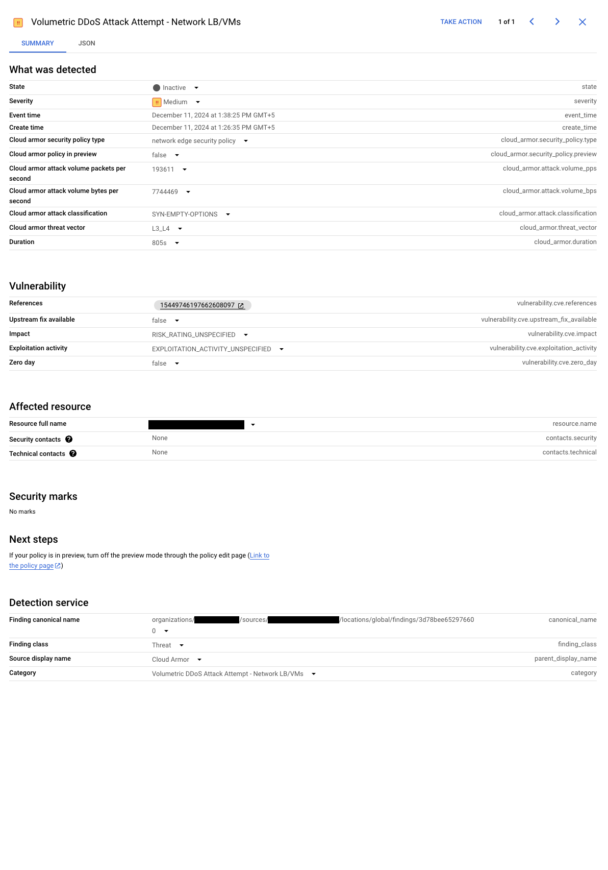 An active Security Command Center finding (click to enlarge). Mitigation ended: when the attack subsides and mitigation ends, the finding becomes inactive, providing a record of the event. The following screenshot shows an example inactive finding: