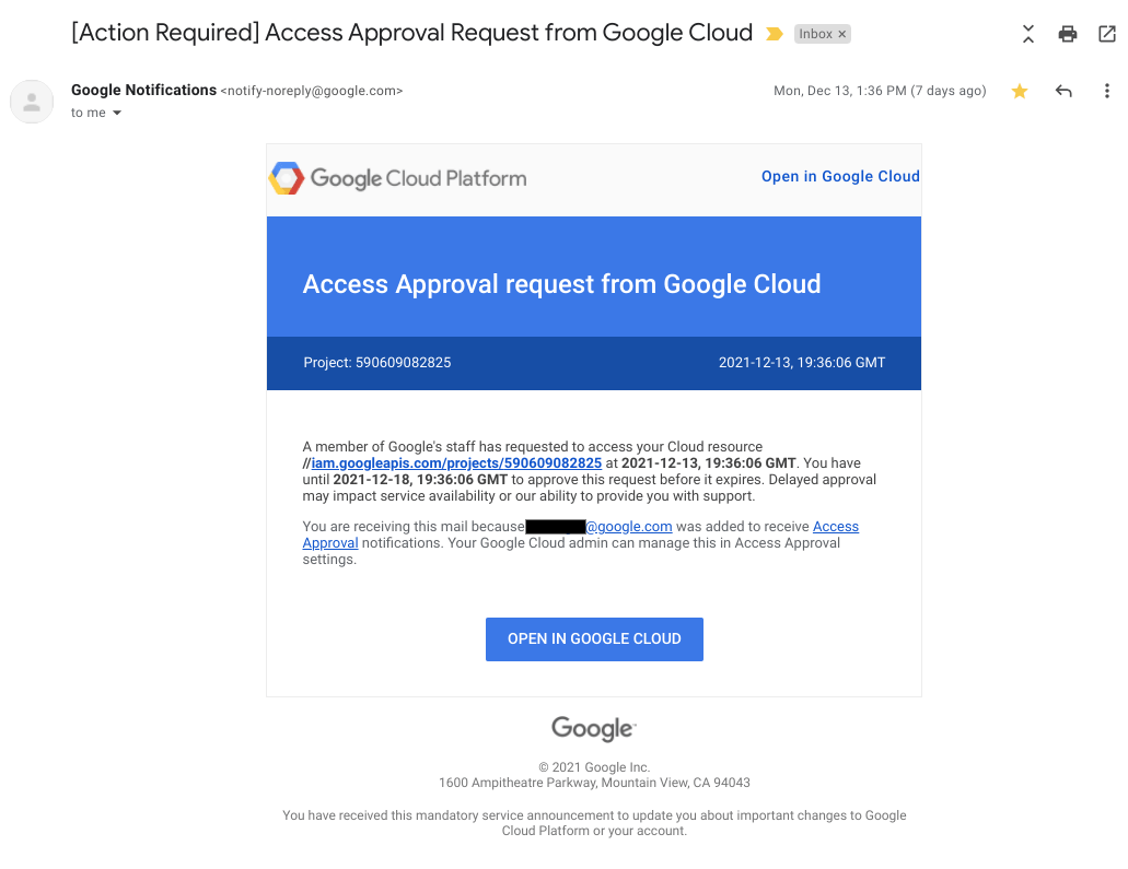The following image shows a sample email notification that Access Approval sends when Google personnel request access to Customer Data.