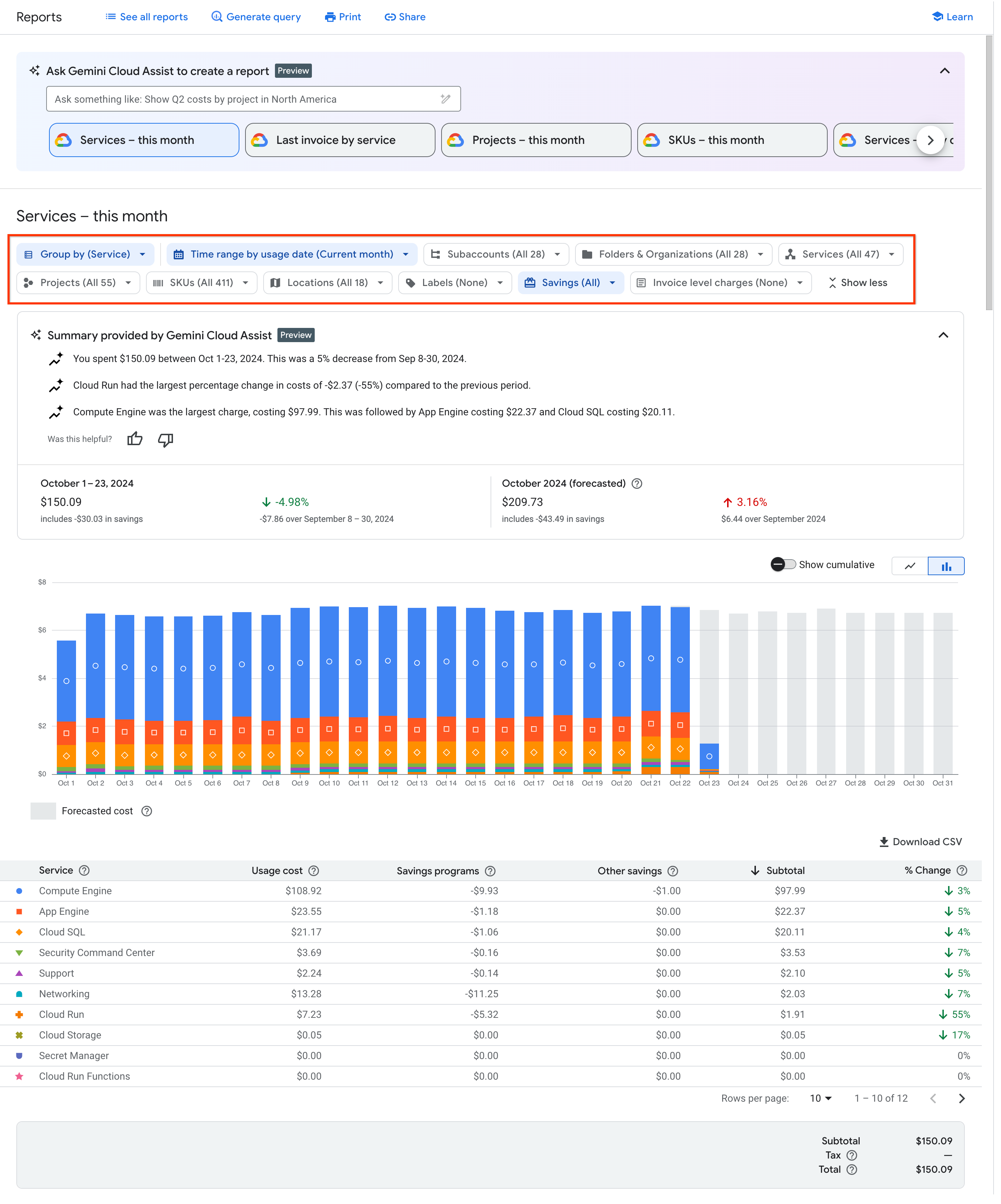 Description: The current calendar month's daily cost for all services and SKUs, grouped by Service (for example, Compute Engine or Cloud Storage), including any usage-specific savings applied, but not including invoice-level charges or credits such as taxes and adjustments. |