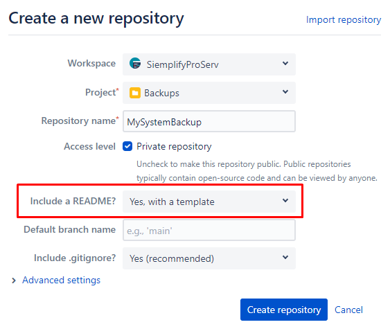 To create a new repository, only one thing is important, and that is including a single file in the repository before configuring it with GitSync. It can be done quickly by including a README file in the root of the repository when creating the repository.