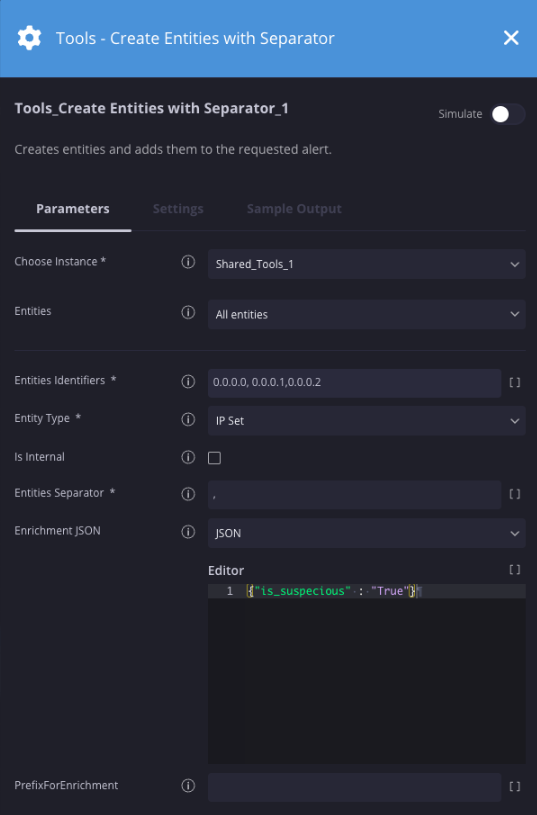 | Normalization data | JSON | N/A | Yes | Specify the JSON in the following format example: [ { "entity_field_name": "AT_fields_Name", "new_name": "InternalEnrichment_Name" }, { "entity_field_name": "AT_fields_Direct-Manager", "new_name": "InternalEnrichment_DirectManager_Name" }, { "entity_field_name": "AT_Manager_fields_Work-Email", "new_name": "InternalEnrichment_DirectManager_Email" } ] |