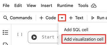 In the toolbar, to add a visualization cell, click the Insert code cell options menu and select Add visualization cell.