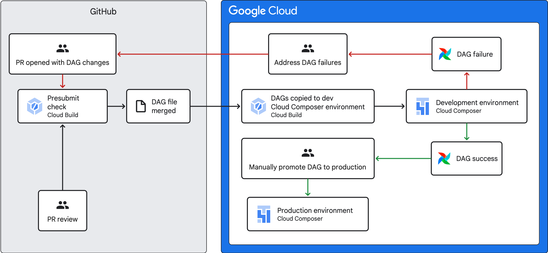 This guide explains how to create a CI/CD pipeline to test, synchronize, and deploy DAGs to your Cloud Composer environment from your GitHub repository.