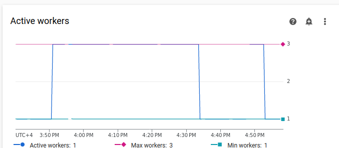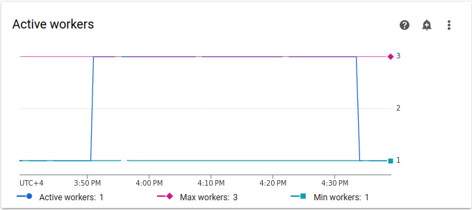Figure 3. Active workers graph (click to enlarge) The Active workers graph indicates that the DAG triggered autoscaling to the maximum allowed limit of three workers during the DAG run.