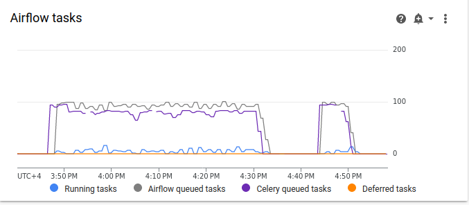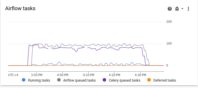 Figure 2. Airflow tasks graph (click to enlarge) In the Airflow tasks graph, there is a spike in queued tasks that lasts for more than 10 minutes, which might mean that there are not enough resources in your environment to process all scheduled tasks.