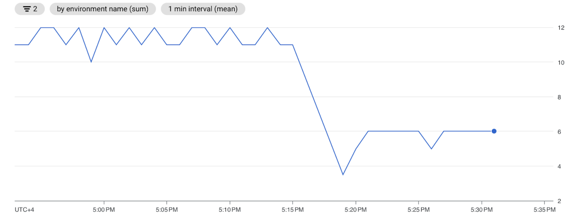 On the graph, you will see the scheduler runs twice less frequently after you changed the default configuration from 5 seconds to 10 seconds. By reducing the frequency of heartbeats, you make sure that the scheduler does not start running while the previous parsing cycle is ongoing and the scheduler's resource capacity is not exhausted.