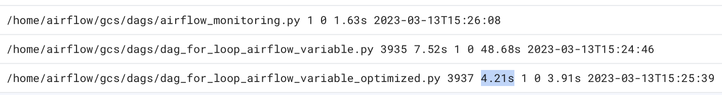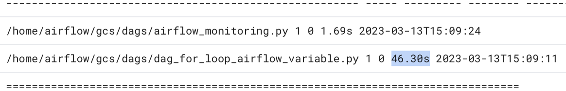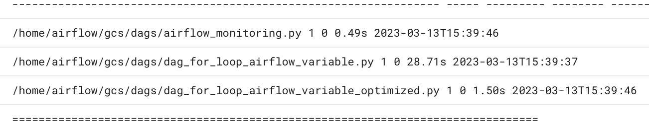 dags reportcommand again to see the parse time for all your DAGs:file | duration | dag_num | task_num | dags ====================+================+=========+==========+===================== /dag_for_loop_airfl | 0:00:37.000369 | 1 | 1000 | dag_for_loop_airflow ow_variable.py | | | | _variable /dag_for_loop_airfl | 0:00:01.109457 | 1 | 1000 | dag_for_loop_airflow ow_variable_optimiz | | | | _variable_optimized ed.py | | | | /airflow_monitoring | 0:00:00.040510 | 1 | 1 | airflow_monitoring .py | | | |Review