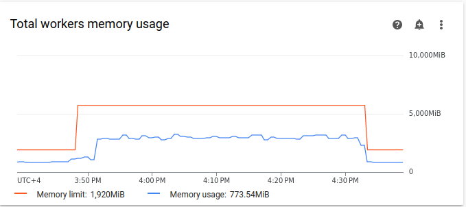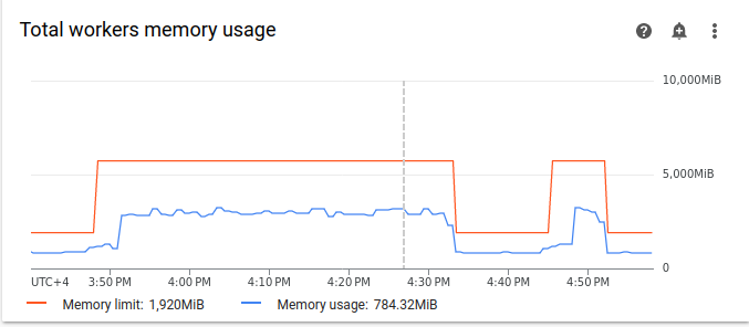 Figure 5. Total workers memory usage graph (click to enlarge) The graphs indicate that the execution of too many tasks simultaneously resulted in hitting the CPU limit. The resources had been used for over 30 minutes, which is even longer than the total duration of 200 tasks in 10 DAG runs running one by one.
