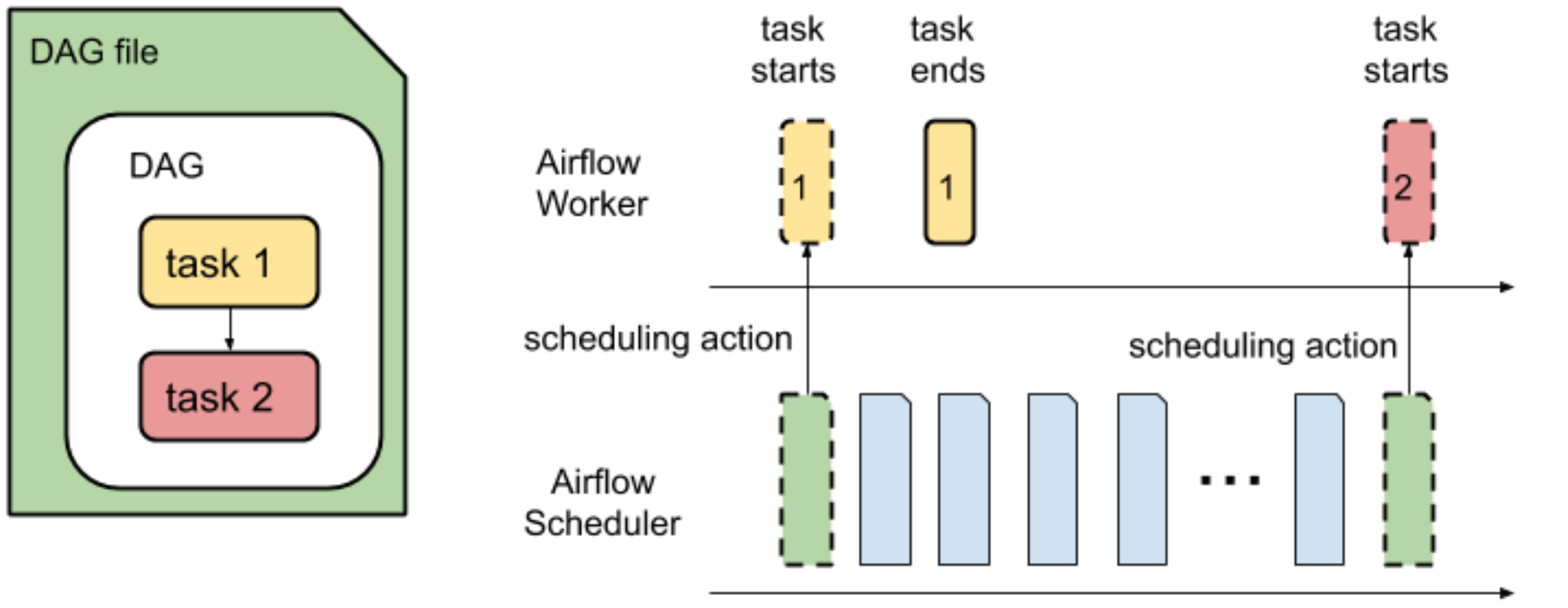 Before the Airflow scheduler can schedule any task from a DAG, the scheduler must parse the DAG file to discover the structure of the DAG and defined tasks. After the DAG file is parsed, the scheduler can start scheduling tasks from the DAG.