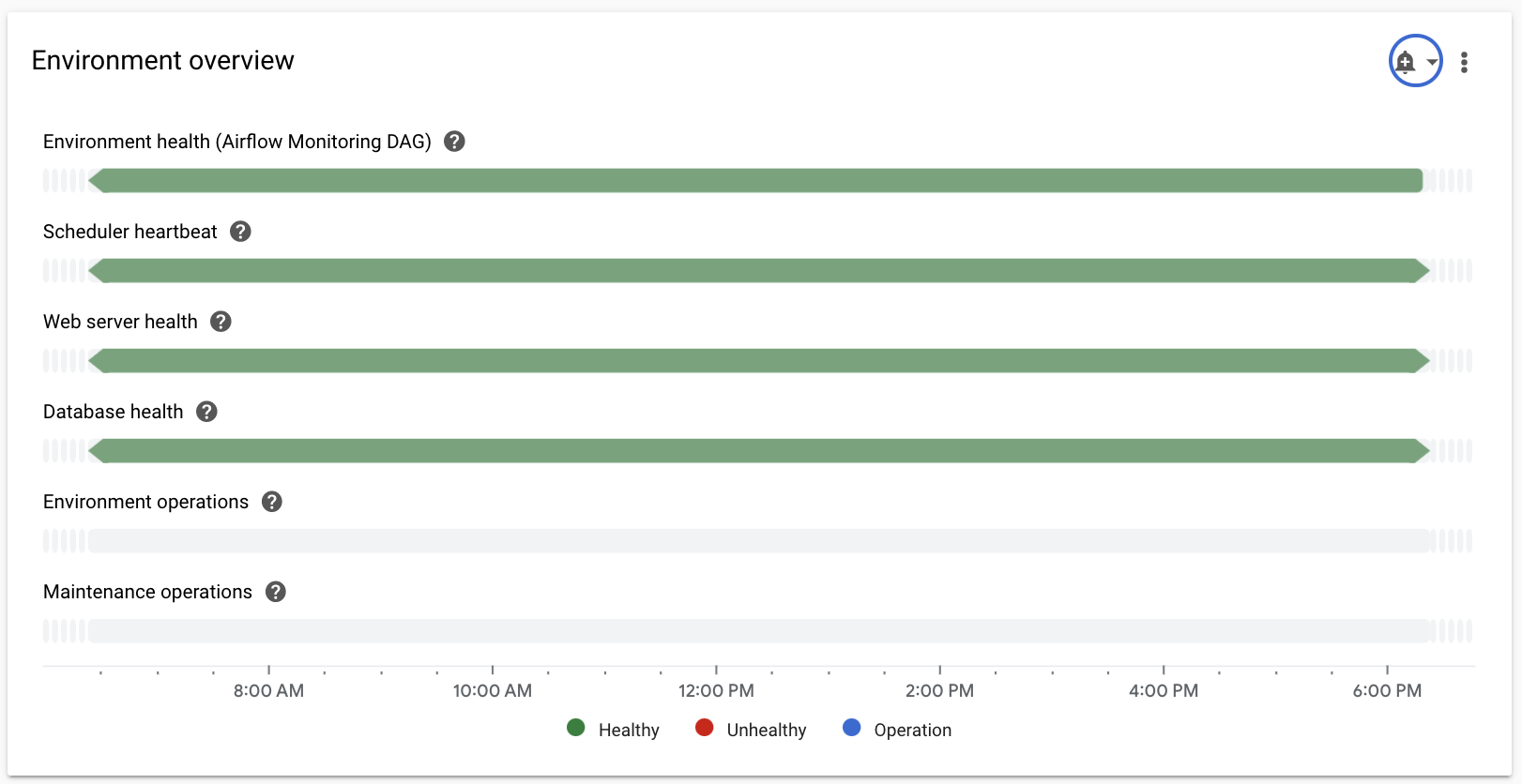 | Environment health (Airflow monitoring DAG) | A timeline showing the health of the Composer deployment. Green status only reflects the status of the Composer deployment. It doesn't mean that all Airflow components are operational and DAGs are able to run. |