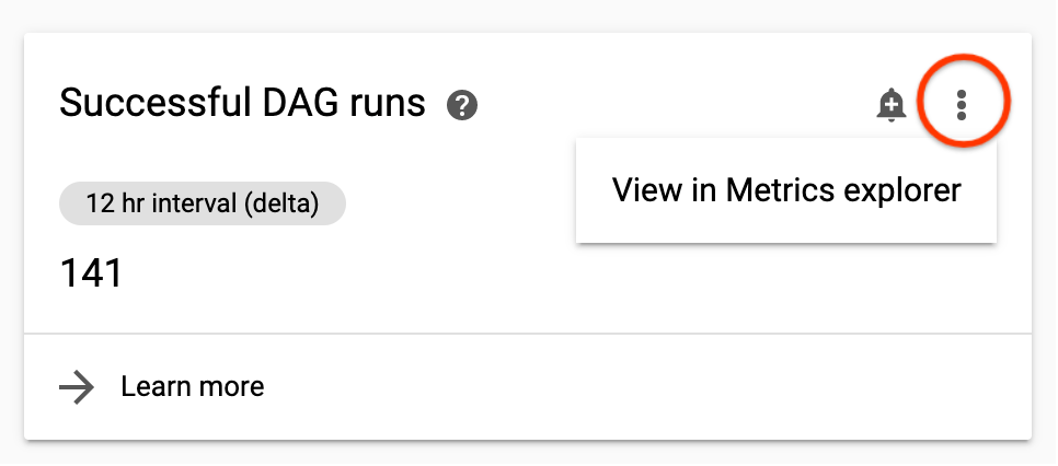 To navigate there from the Cloud Composer monitoring dashboard, click the three dots in the upper-right corner of a metric card and select View in Metrics explorer.