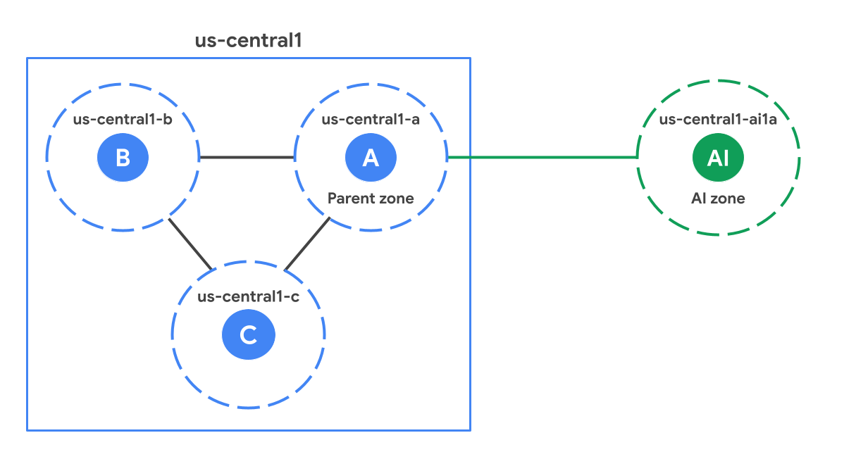 AI zone. For example, in the diagram, us-central1-a is the parent zone of