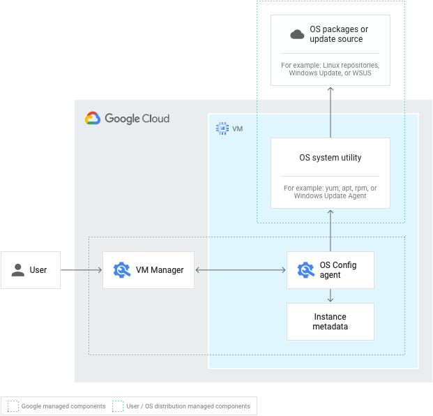 yum,apt,rpmor the Windows Update Agent) to retrieve patches or updates from the OS package or update source and apply them to the VM. For more information, see How Patch works. - For OS policies, the OS Config agent uses OS system