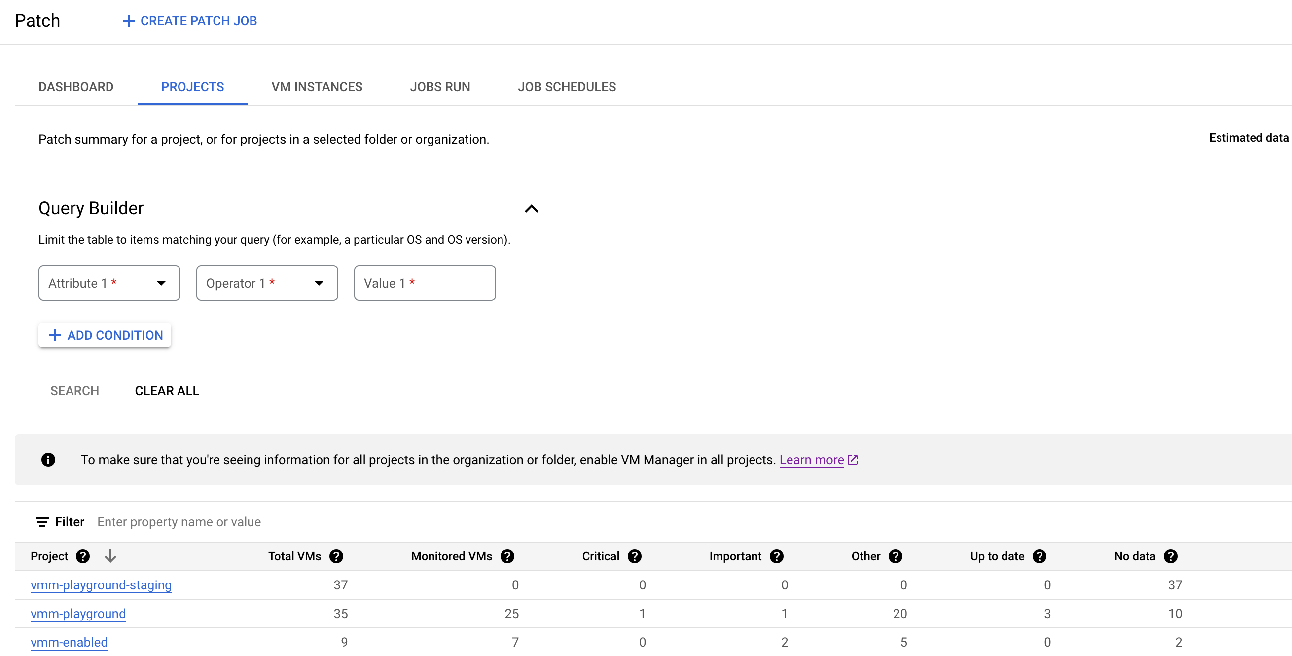 Based on the criteria that you specify using the query builder, VM Manager computes and displays the patch summary for VMs in the projects in your organization or folder. You can then use the table filters in the Patch summary table to filter the displayed data.