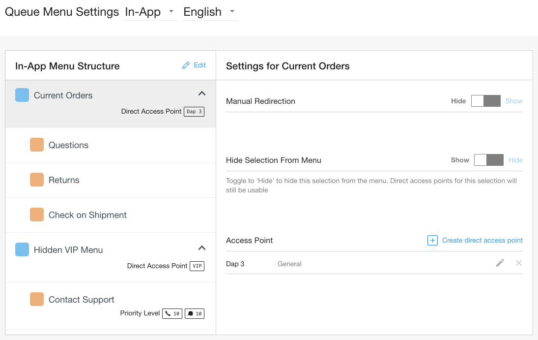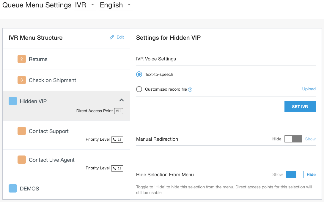 1. Navigate to Settings > Queue > IVR and select your desired top-level queue.