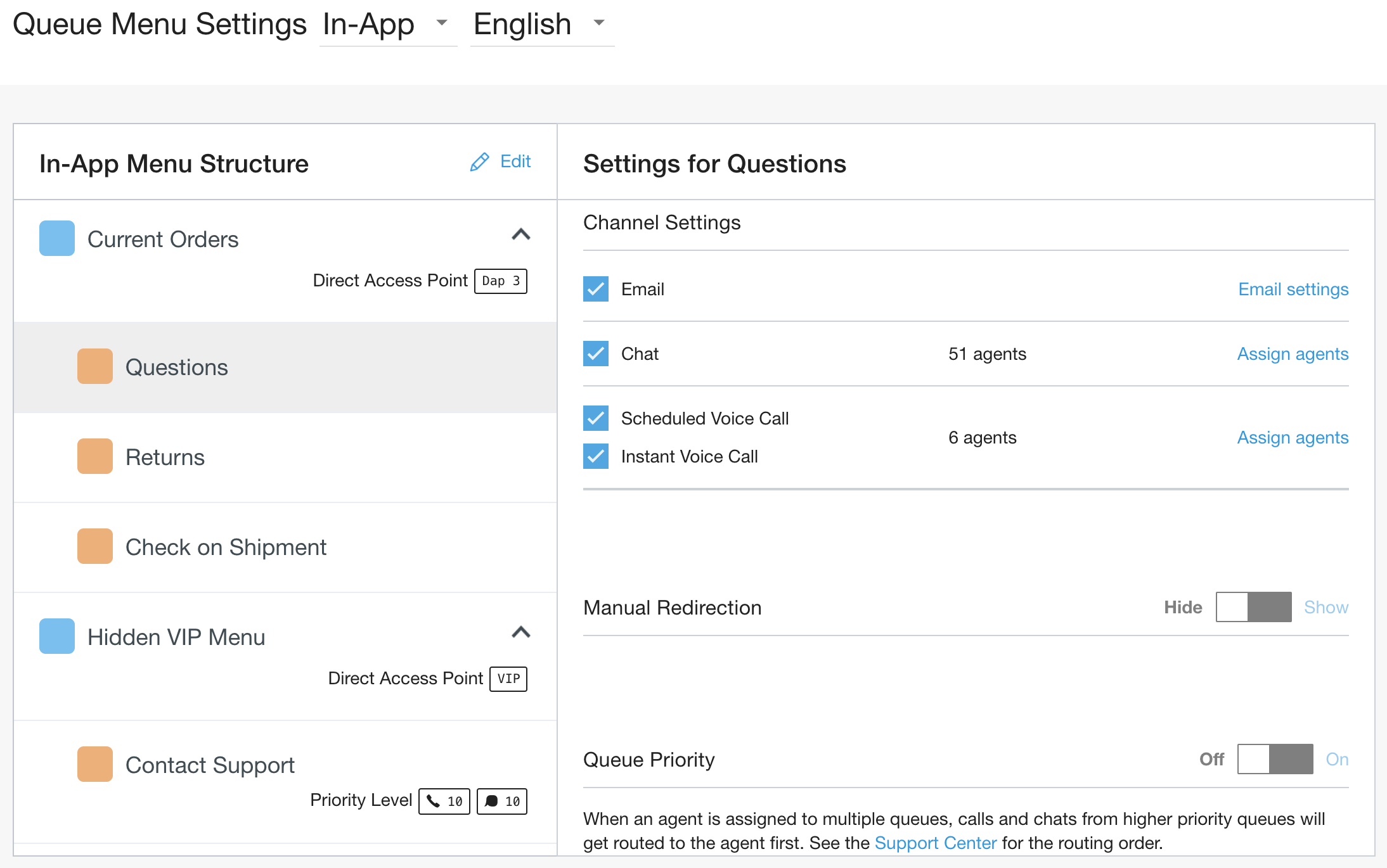 For top-level queues, custom IVR fallback selection options are available in the queue level menu settings. You can specify a fallback destination for when an end-user fails to select a queue during IVR navigation.
