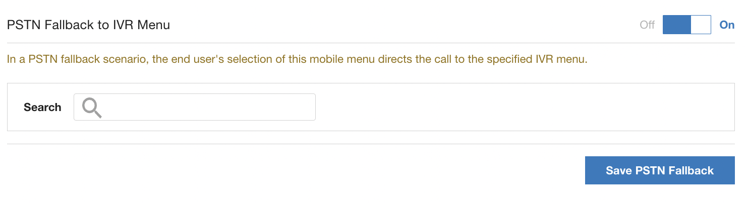 The PSTN fallback option will be presented after the end-user navigates the Mobile queues. When the end-user selects to make a call and the app determines it is in PSTN fallback mode, the PSTN call will be mapped to a pre-configured, corresponding destination menu in the IVR queue. Since IVR and Mobile menus are often not identical, each Mobile menu selection needs to be paired with a corresponding IVR menu to use for fallback.