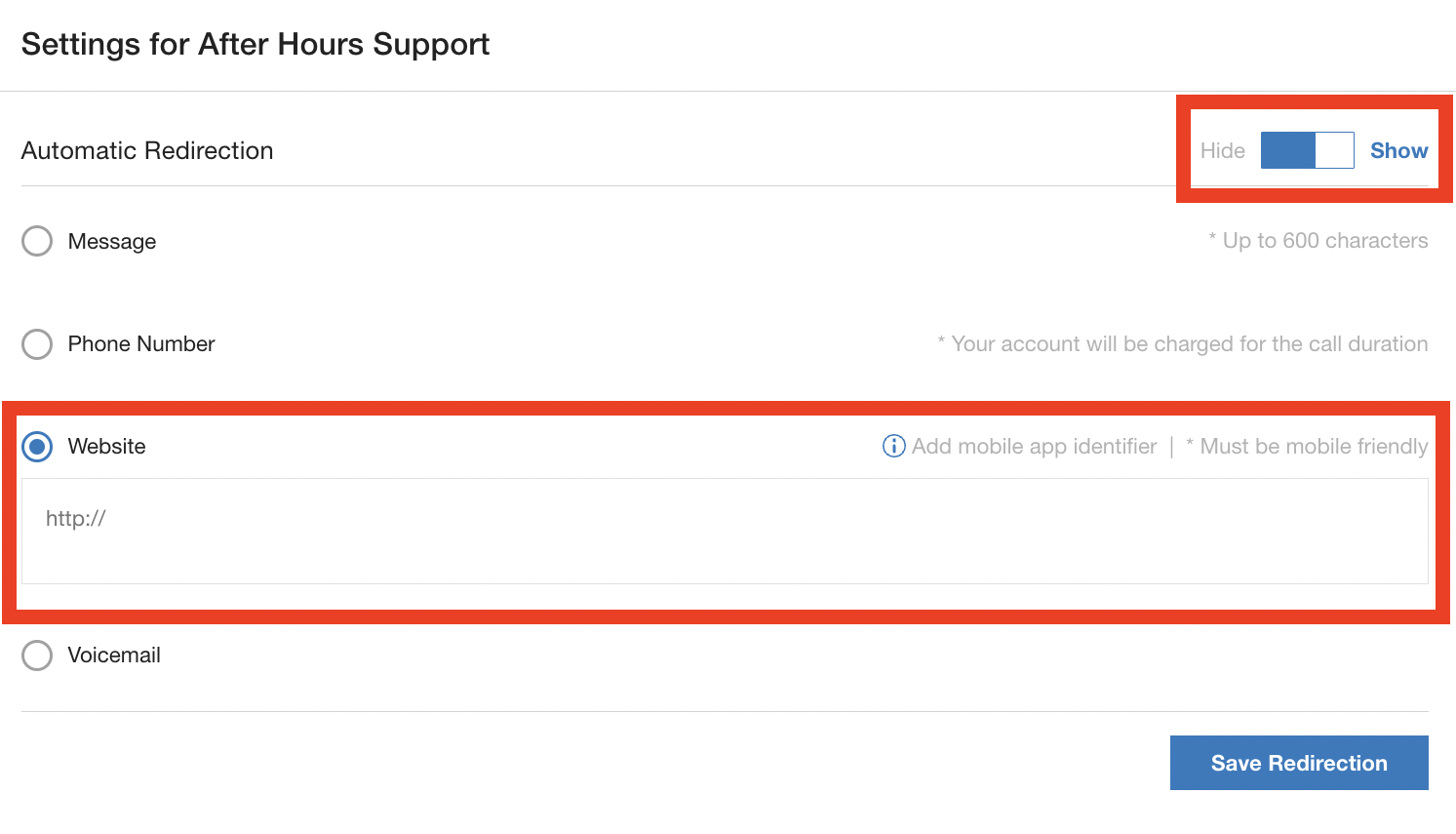 3. Click to show Automatic Redirect options, then click Website.