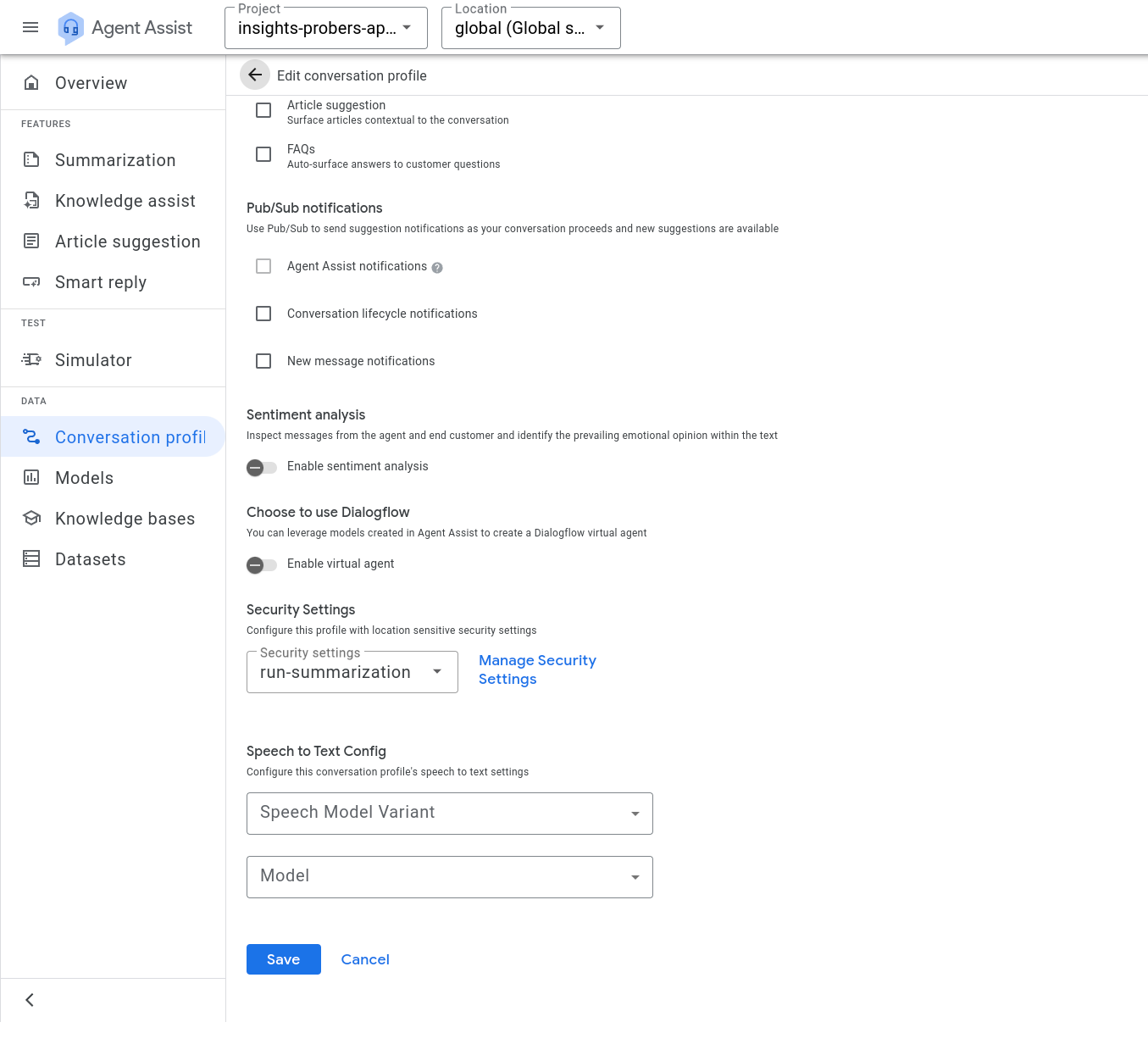- Create a conversation profile using the Agent Assist console by following the tutorial instructions. Don't enable the virtual agent option.