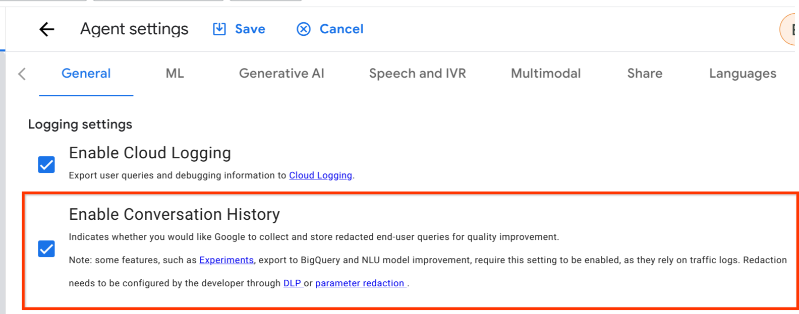 Ensure Enable Conversation History is checked.