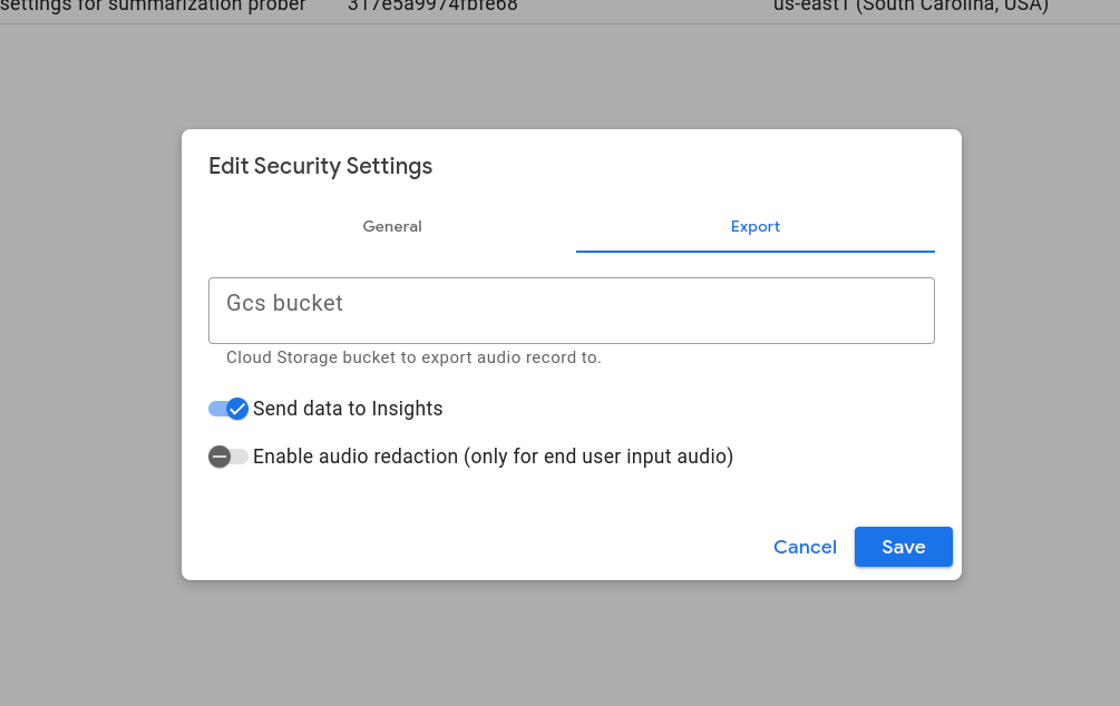 audio_export_settings, CX Insights will only have access to the transcript and cannot play back the conversation audio.- Go to the security settings page at the following link. Enter your project ID where indicated.