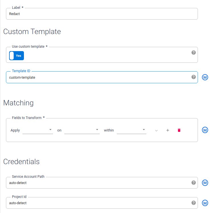 Back in the Cloud Data Fusion web UI, in the Redact properties menu, under Template ID, enter the template ID of the custom template you created.