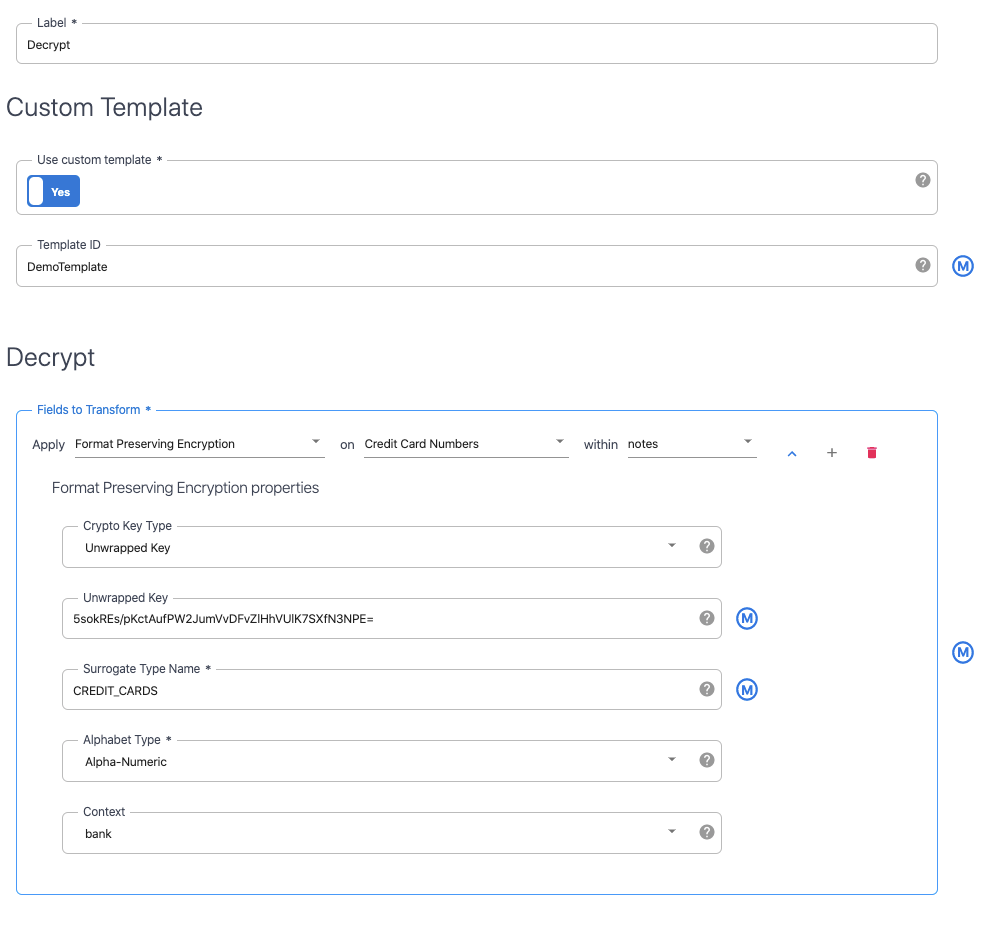 The Decrypt transform lets you decrypt sensitive data that was previously encrypted using the Redact transform,