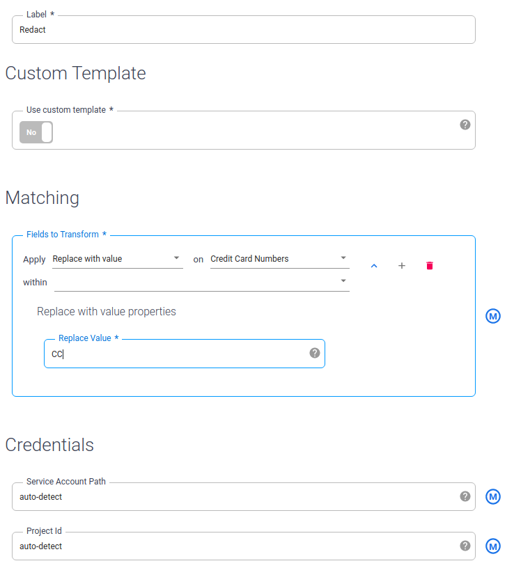 The Redact transform lets you transform sensitive data, such as masking the data or encrypting it.