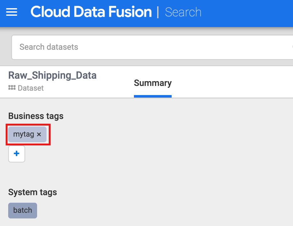 Cloud Data Fusion also supports the annotation of datasets with business metadata, such as tags and key-value properties, which can be used as search criteria. For example, to add and search for a business tag annotation on the Raw Shipping Data dataset: