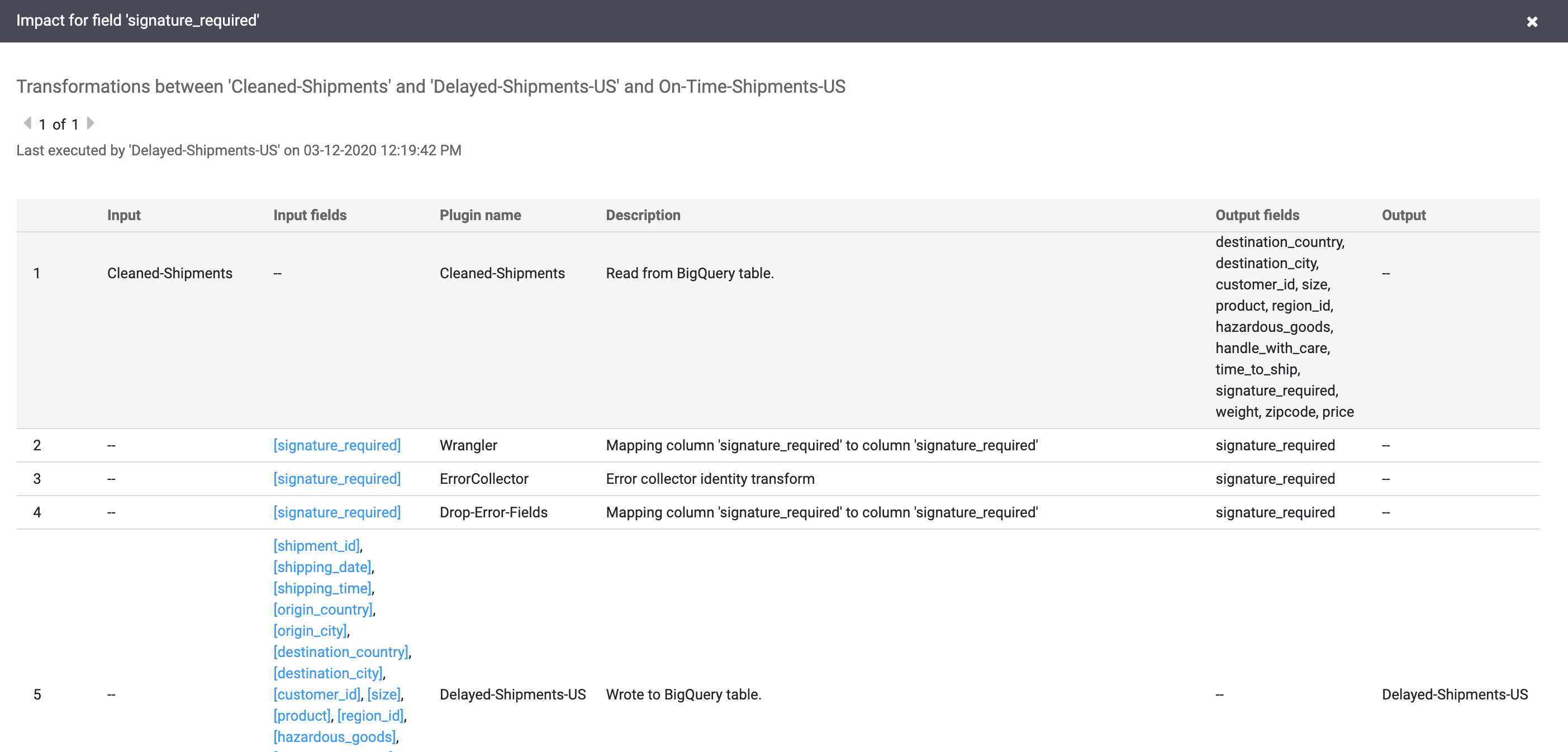 The cause and impact links show the transformations performed on both sides of a field in a human-readable ledger format. This information can be essential for reporting and governance.