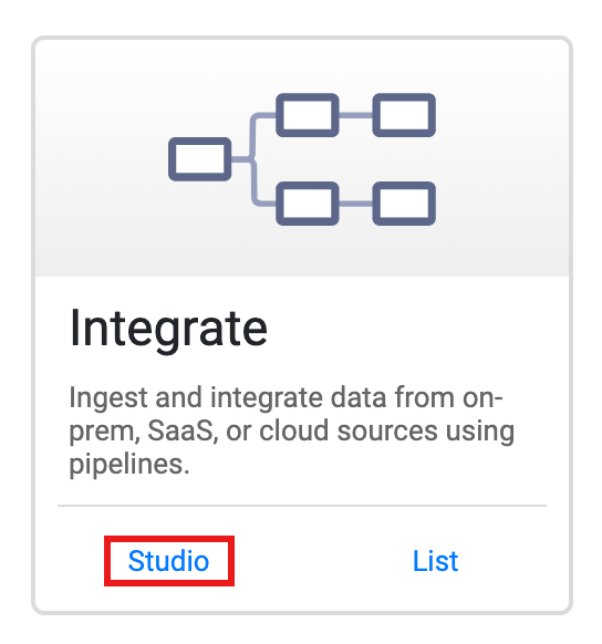 In the Integrate pane, click Studio to open the Cloud Data Fusion Studio page.