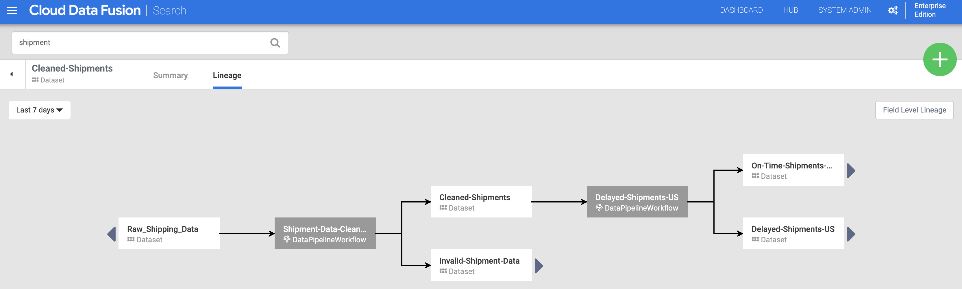 These tutorial pipelines demonstrate a typical scenario in which raw data is cleaned then sent for downstream processing. This data trail from raw data to the cleaned shipment data to analytic output can be explored using the Cloud Data Fusion lineage feature.